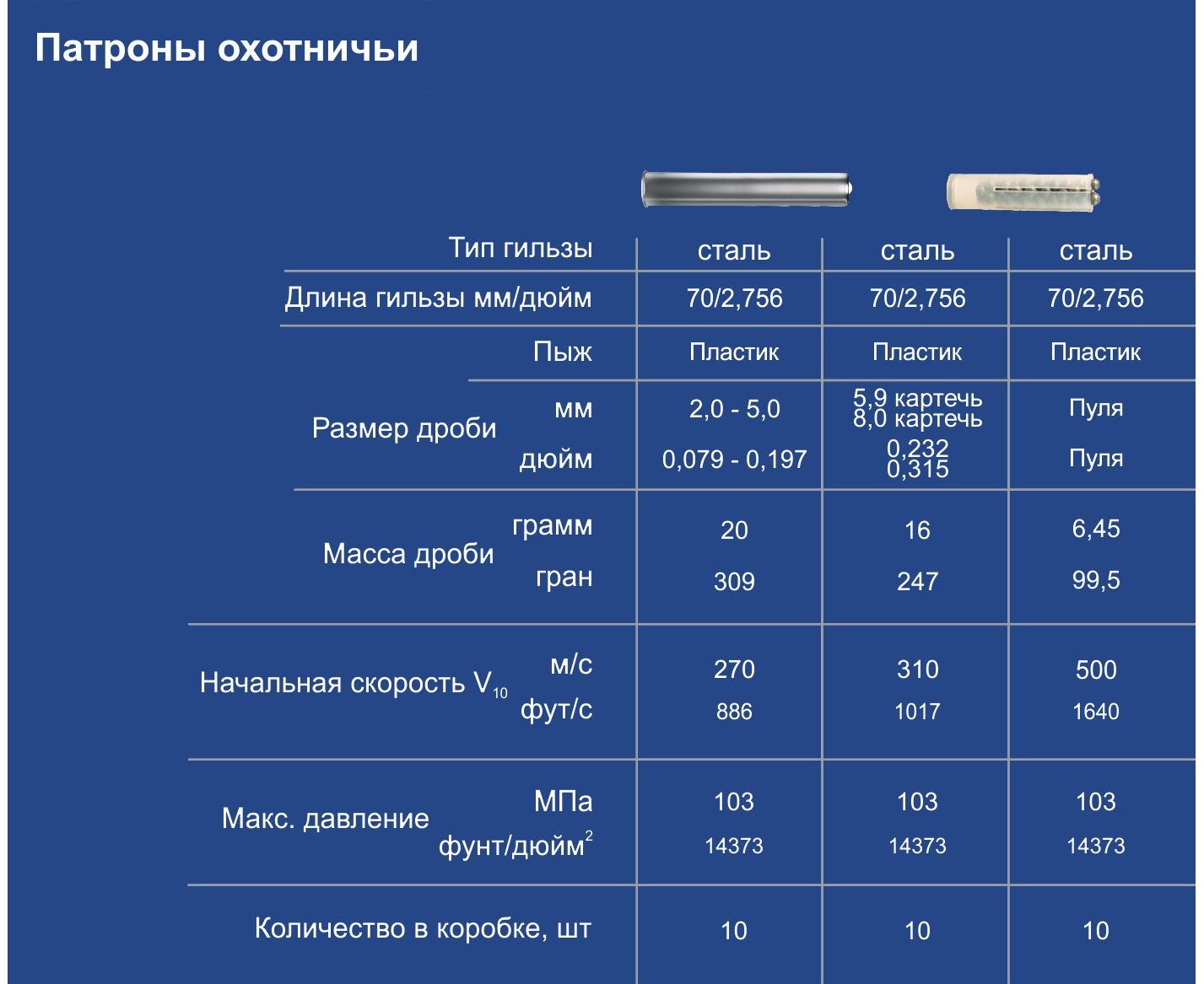 В патронах используется порох охотничий "Сунар-410". Пороховой заряд ~ 1,4 г. Пуля массой 6,3 г в контейнере. Максимальное давление пороховых газов 90 МПа. Средняя скорость полета пули на расстоянии 10 м от дульного среза, на менее 490 м/с. Кучность стрельбы (диаметр круга рассеивания Пср.) на дистаниции 35 м, не более 12 см. В дробовых патронах используется дробь от №0000 до №8