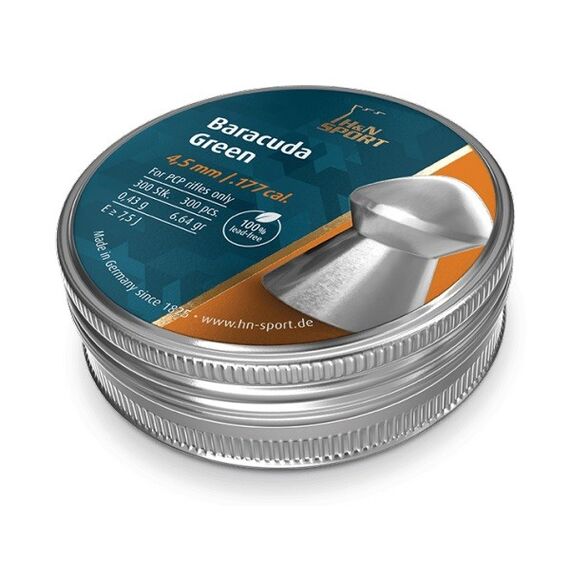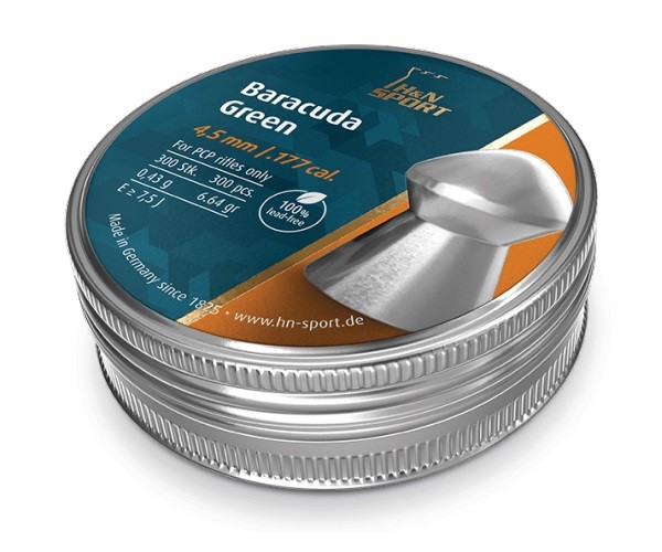 Пули H&N Baracuda Green - бессвинцовые, легкие сверхскоростные пули, чрезвычайная точность для соревнований и охоты. Достигает почти скорость звука, очень настильная траектория полета для средних дистанций. Ствол не освинцовывается, улучшенное прохождение по каналу ствола, отсутствие контакта со свинцом благодаря специальному оловянному сплаву. Высокая пробиваемость и кучность. Поверхность гладкая. В упаковке 300 штук.