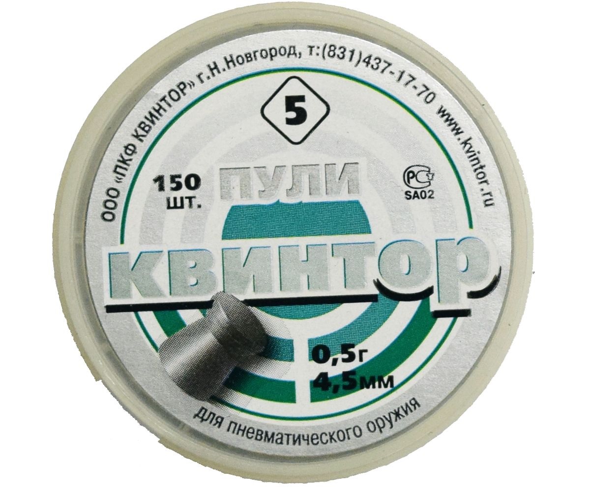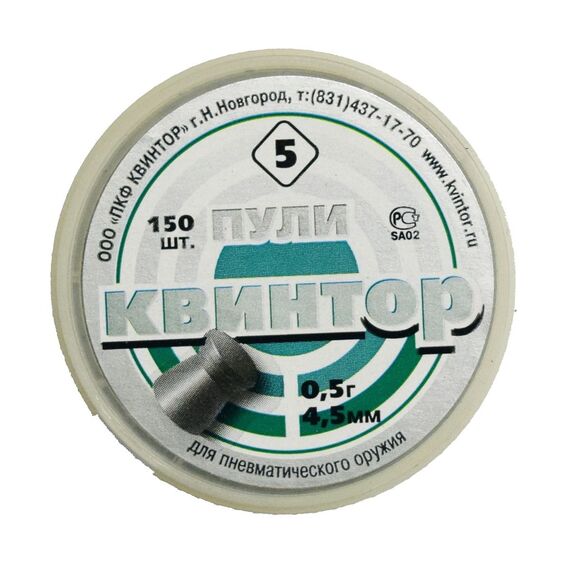Расчетный вес пули Квинтор 5 в 0.5 грамма специально подобран для оружия средней мощности -- указанная масса дает уверенную траекторию на внушительных дистанциях, сохраняя необходимую энергию для поражения целей. Отличительной чертой этих пуль выступает плоская головка. Такая конструкция демонстрирует наглядный результат при стрельбе по плоским мишеням, снижая вероятность рикошетов и улучшая видимость результатов практики.
