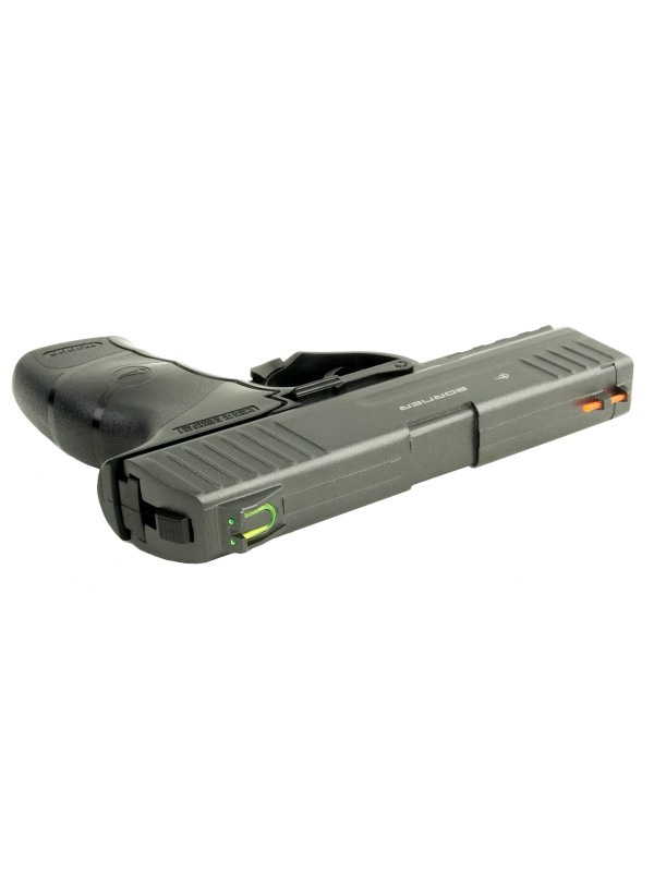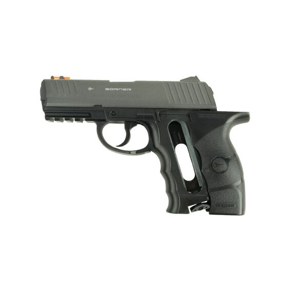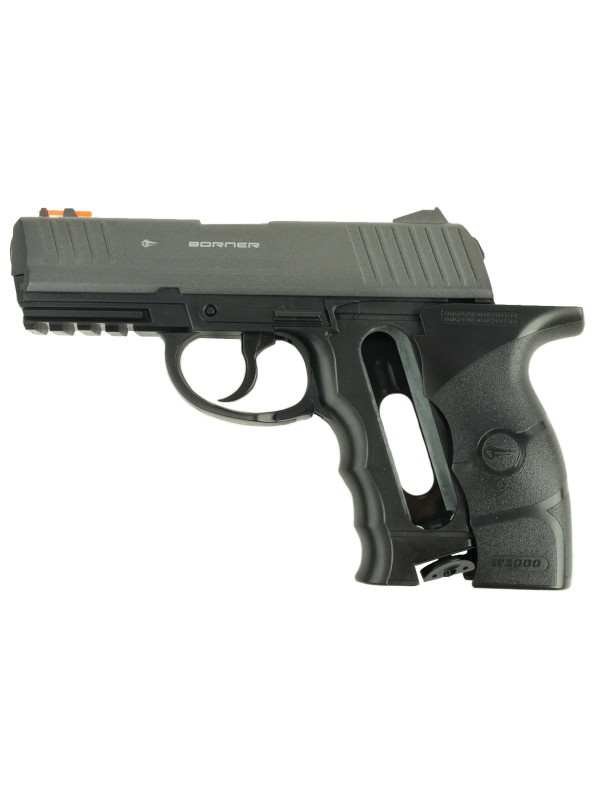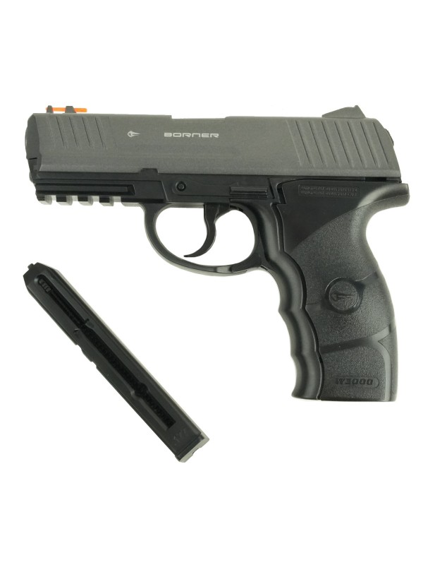 Несмотря на доступную цену пистолет изготовлен очень качественно. Рамка выполнена из прочного пластика, а затвор – из металлического сплава. На рукояти есть рельефная накладка, которая улучшает сцепление между рукой и оружием и снижает вероятность его выскальзывания. Благодаря небольшим подпальцевым выемкам на передней стороне рукояти держать пистолет очень удобно. Вес его составляет 550 гр. С таким весом и удобной рукоятью можно упражняться в стрельбе долгое время без дискомфорта, вызываемого усталостью руки. Borner W3000 относится к газобаллонным пистолетам. Резервуар для установки баллончика с СО2 скрыт за накладкой рукояти.