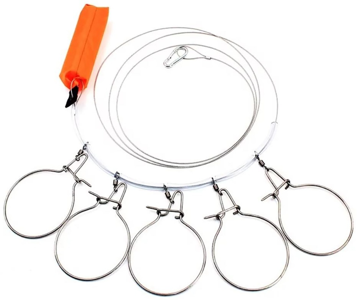 Кукан «NAMAZU» подойдет для бережной транспортировки трофеев при ловле с лодки. Надежные застежки не дадут норовистой рыбе сорваться, проволока не боится щучьих зубов. Карабины закреплены при помощи вертлюгов на определенном расстоянии. В качестве разграничителей используются силиконовые трубочки. Крепится к лодке (колышкам и т.д.) с помощью надежных карабинов.
