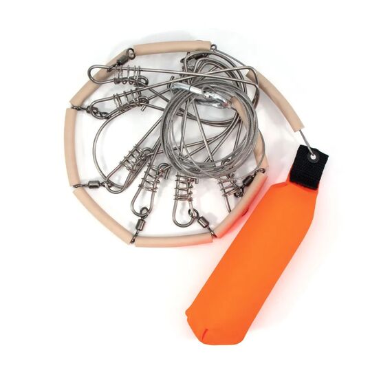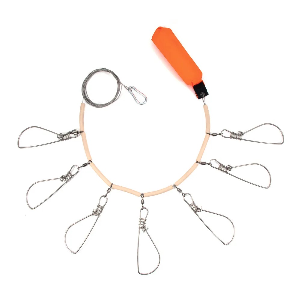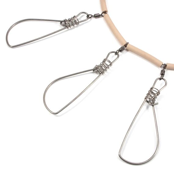 Кукан «NAMAZU» подойдет для бережной транспортировки трофеев при ловле с лодки. Надежные застежки не дадут норовистой рыбе сорваться, проволока не боится щучьих зубов. Карабины закреплены при помощи вертлюгов на определенном расстоянии. В качестве разграничителей используются силиконовые трубочки. Крепится к лодке (колышкам и т.д.) с помощью надежных карабинов.