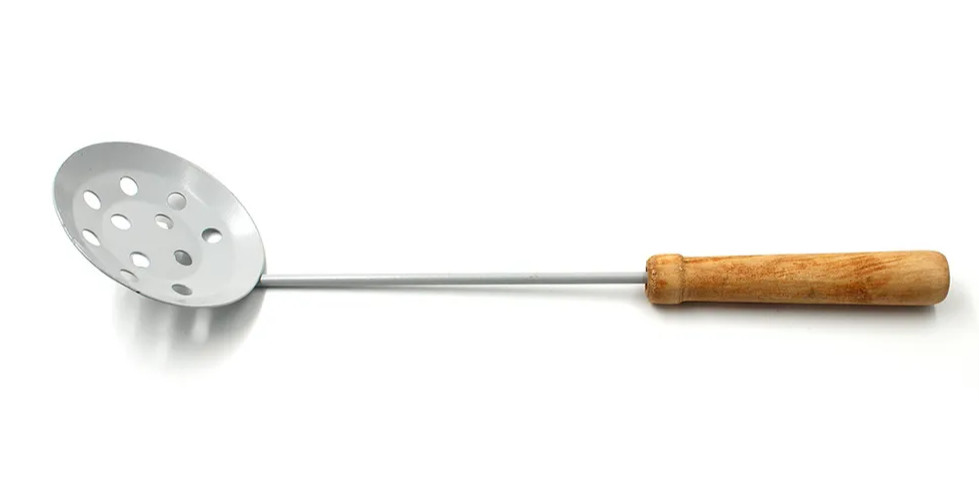 Ложка черпака имеет вид шумовки, изготовлена из стали, дополнительно окрашена полимерной порошковой краской. Ручка черпака изготовлена из берёзы, покрыта специальным защитно-декоративным составом и имеет удобную форму, предотвращающую выскальзывание черпака из рук.