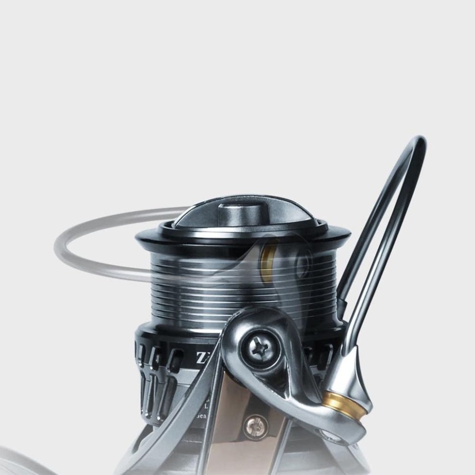 Отличительной особенностью этой разновидности катушек является расположение шпули — ось её вращения направлена вдоль удилища (тогда как ось вращения рукоятки — поперёк). Это позволяет при разматывании лески оставлять барабан неподвижным, благодаря чему обеспечивается простота в использовании: инерция при забросе практически отсутствует и вероятность запутывания минимальна. Ещё одним достоинством является защита от обрывов лески — в виде фрикционного тормоза. Выпускается множество разновидностей безынерционных катушек, с разной специализацией — «силовые», скоростные и т.п. В целом же подобные модели имеют неплохие эксплуатационные характеристики при относительно невысокой стоимости, благодаря чему они получили широкое распространение. Из недостатков этого варианта можно выделить разве что сложность конструкции и несколько меньшую надёжность, чем у нахлыстовых.