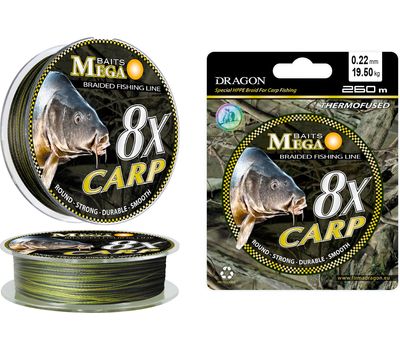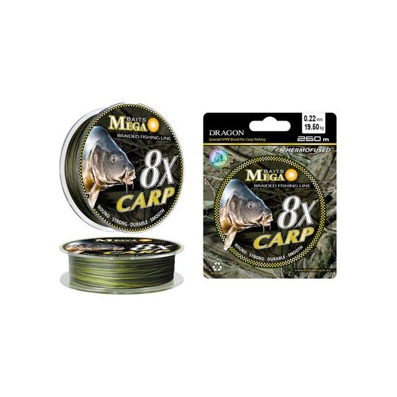 Современная, круглая, восьмижильная плетенка, изготовленная для ловли карпа. Плетенка MegaBAITS Baits прошла испытания на разнообразных водоемах и оказалась очень надежной. Благодаря новой технологии плетения, шнур показал себя только с лучшей стороны! Имея практически нулевую растяжимость сигнал о поклевке передается очень быстро, а это в свою очередь дает возможность мгновенной подсечки рыбы на большом расстоянии. Плетенки Mega Baits Carp 8X с успехом можно использовать для ловли большого карпа в заросших водоемах с зацепами, раковинами, твердыми стеблями растений. Благодаря защитному слою на поверхности, плетенка более стойкая к истиранию или перерезанию. Она позволит рыбачить там, где до сих пор это казалось невозможным. У плетенки круглое сечение и хорошая эластичность, благодаря чему можно выполнять дальние и точные забросы. Повышенная прочность на узле дает возможность использовать более легкий комплект, а также удержать большого карпа при вываживании. Плетенка Mega Baits Carp 8X защищена от воздействия УФ-излучения, и она не потеряет своих свойств при длительном использовании. Точно подобранная камуфляжная расцветка позволяет повы- сить эффективность ловли. Плетенка не запутывается, что облегчает ловлю начинающим рыболовам и ловлю в тяжелых погодных условиях. Шнур предназначен для карповой ловли, однако пригодится также и для ловли остальными донными методами. Размотка: 300 м.