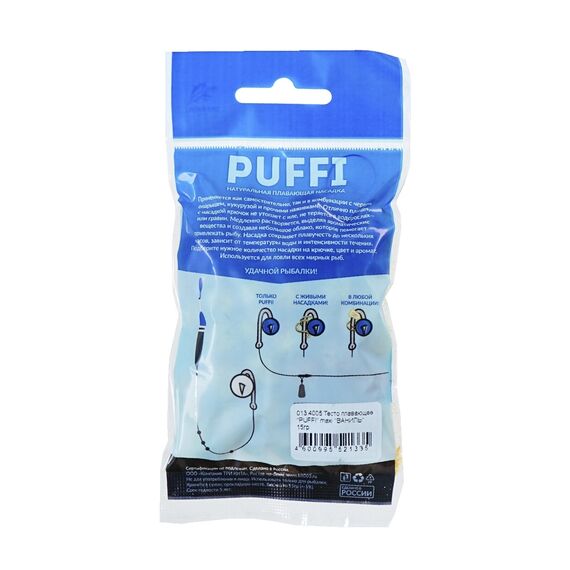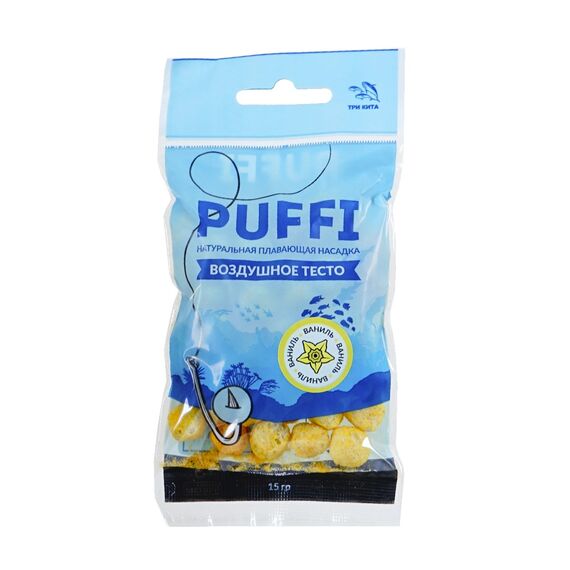 Тесто плавающее "PUFFI" maxi производства компании ТРИ КИТА — продукт российского рынка рыболовных снастей. Благодаря специальной рецептуре и технологии изготовления тесто PUFFI обладает уникальной способностью всплывать над поверхностью воды, привлекая рыбу даже в условиях плохой видимости. Продукт имеет легкую пористую структуру, благодаря чему приманка быстро пропитывается водой и приобретает аромат, привлекающий внимание рыбы.