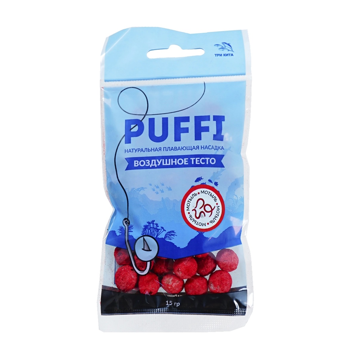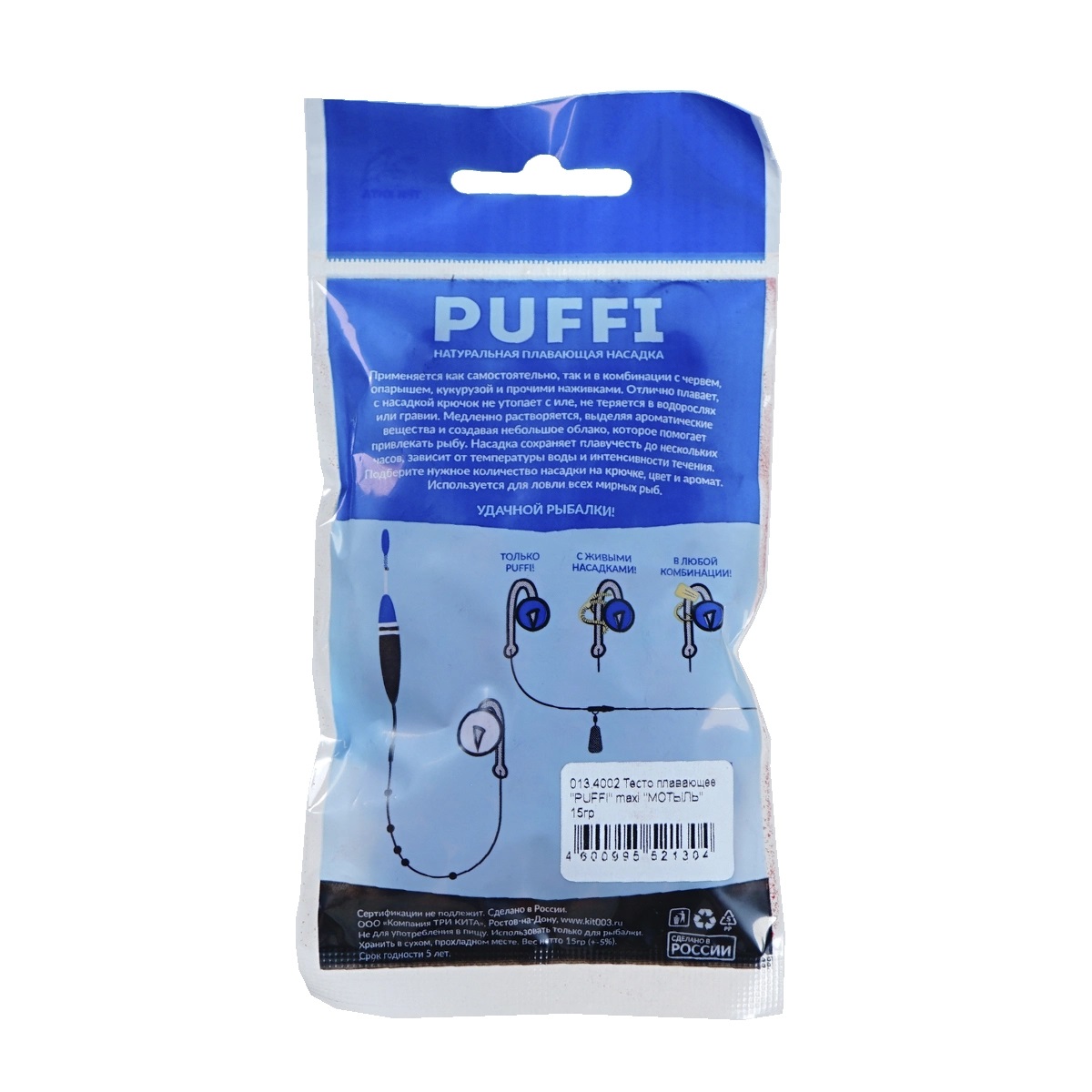 Тесто плавающее "PUFFI" maxi производства компании ТРИ КИТА — продукт российского рынка рыболовных снастей. Благодаря специальной рецептуре и технологии изготовления тесто PUFFI обладает уникальной способностью всплывать над поверхностью воды, привлекая рыбу даже в условиях плохой видимости. Продукт имеет легкую пористую структуру, благодаря чему приманка быстро пропитывается водой и приобретает аромат, привлекающий внимание рыбы.