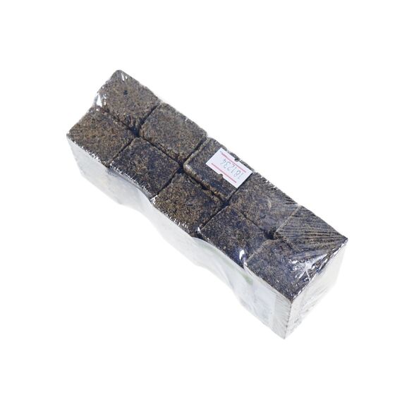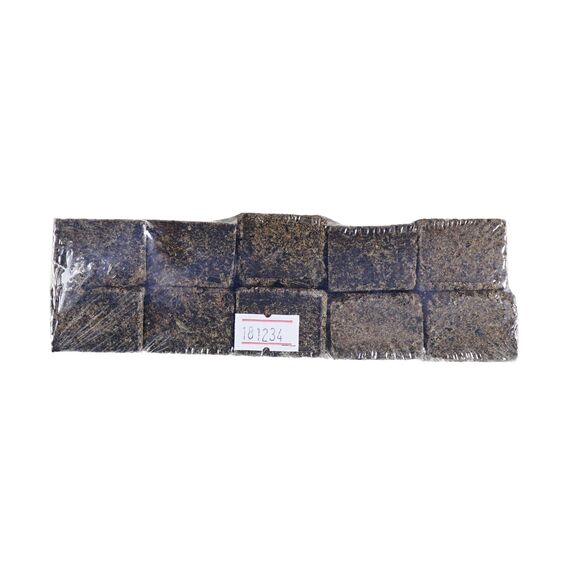 Представляет из себя прессованную в серого цвета кубики смесь из жмыха подсолнечника и дополнительных ингредиентов. Упакована в плотную пленку по 10 кубиков. Масса упаковки - 420 грамм. Имеется отверстие под крючок. Время растворения зависит от температуры воды, количества малька в водоеме, наличия и интенсивности течения и в среднем составляет от 3-х часов.