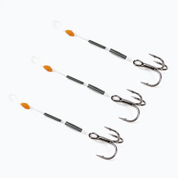 Короткие поводки с небольшим тройником, предназначены для дополнительного усиления приманок на судака малого и среднего размера.