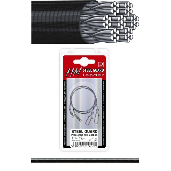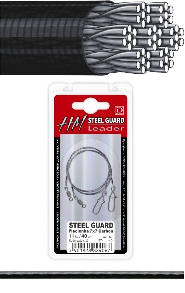 Лидер CARBON представляет собой стальную оплетку из 49 волокон серебристого цвета с прозрачным нейлоновым покрытием, повышающим устойчивость к скручиванию. Очень точное плетение, мягкое и очень гладкое на поверхности. Чрезвычайно тонкий по сравнению с его прочностью. Завершается вертлюгом с одной стороны и английской булавкой с другой.