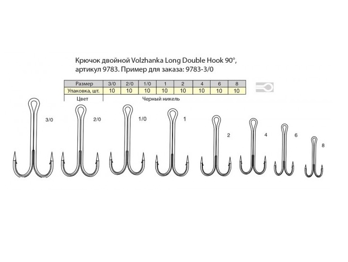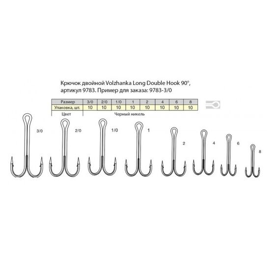 Крючок двойной Volzhanka 9783 Long Double Hook 90° 3/0 (10шт/уп)