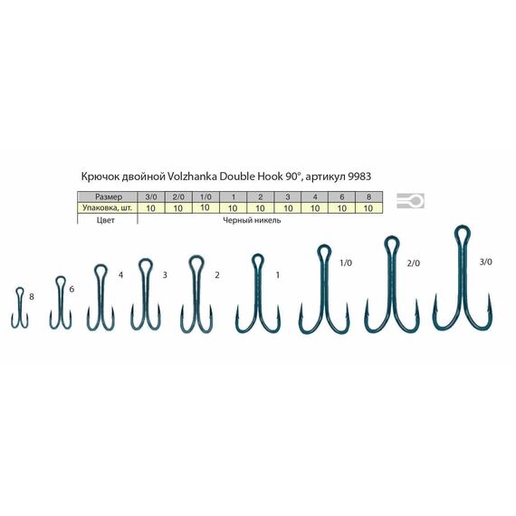 Крючок двойной Volzhanka 9983 Double Hook 90° 2/0 (10шт/уп)
