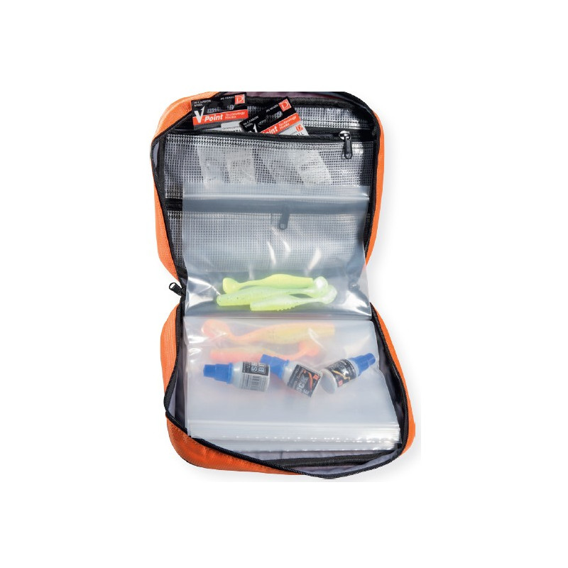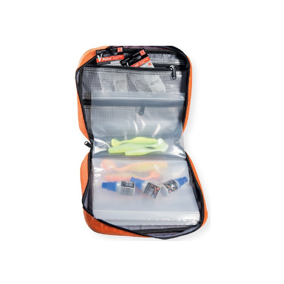 Очень практичный чехол для использования при различных способах ловли рыбы на берегу или на борту лодки. Во многих случаях он заменит сумку с наживками или небольшими аксессуарами, такими как крючки, запасные поводки, вертлюжки и т. д. Он идеально подходит для переноски ароматизированных искусственных наживок, например: соусы (грязные и очень ароматные). Дополнительные 3 кармана изготовлены из очень прочного и прозрачного материала. Сменные сумки позволяют создавать комплекты аксессуаров для отдельных мест рыбалки. Стенки чехла обшиты мягким поролоном, используются прочные молнии, и все прочно сшито. Размеры (Д/Ш/В): 25 x 20 x 6 см. Вес: 311 г.