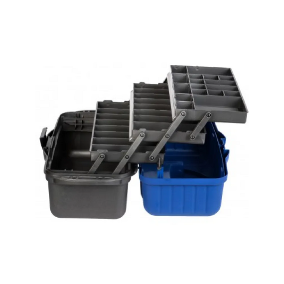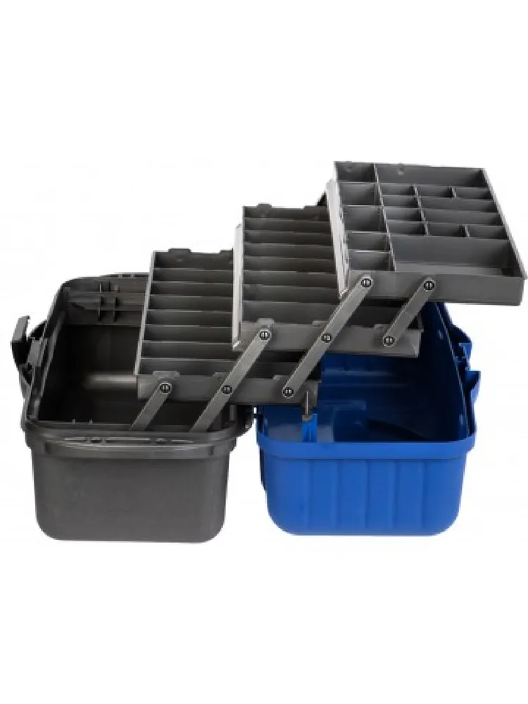 Удобный и вместительный ящик с тремя выдвижными полками для различной рыболовной оснастки: поплавков, приманок, крючков и другой полезной мелочи. Количество секций варьируется от 24 до 34. На дно ящика можно положить 1-3 спиннинговых катушек.
