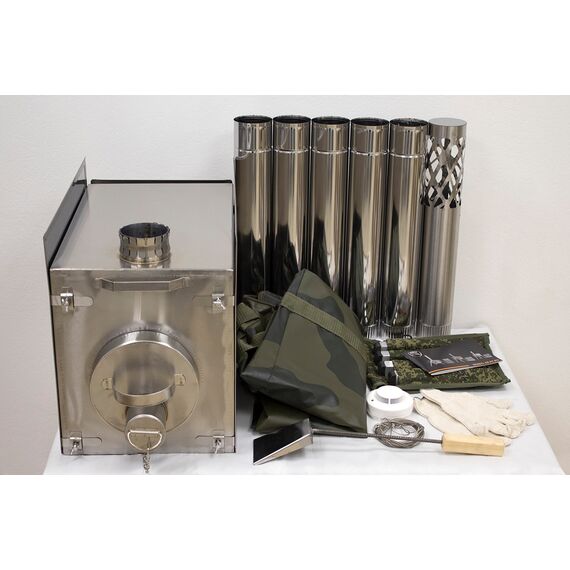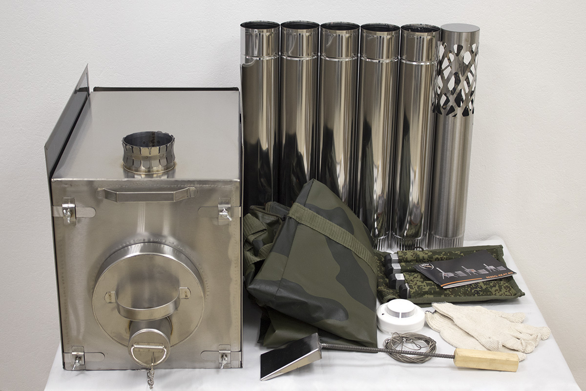 В комплекте с печью поставляется совок для очищения от золы, прочная сумка из ПВХ, трубы дымохода, ножки в отдельном чехле и паспорт изделия.