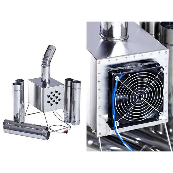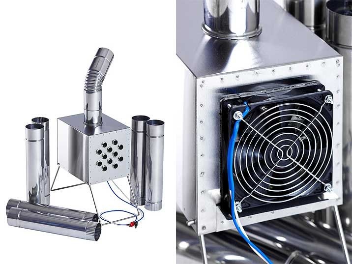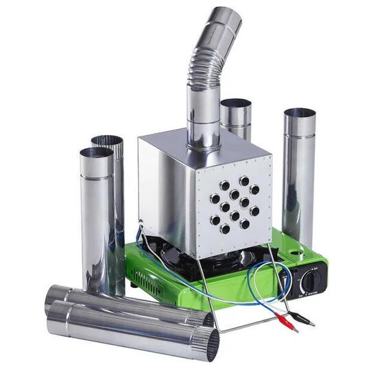 Состоит из металлического короба с проходящими сквозь него трубками с оснащенным выходом под дымоходную трубу, складных ножек и входного отверстия для размещения под ним газовой плитки или горелки, вентилятора (12 В).