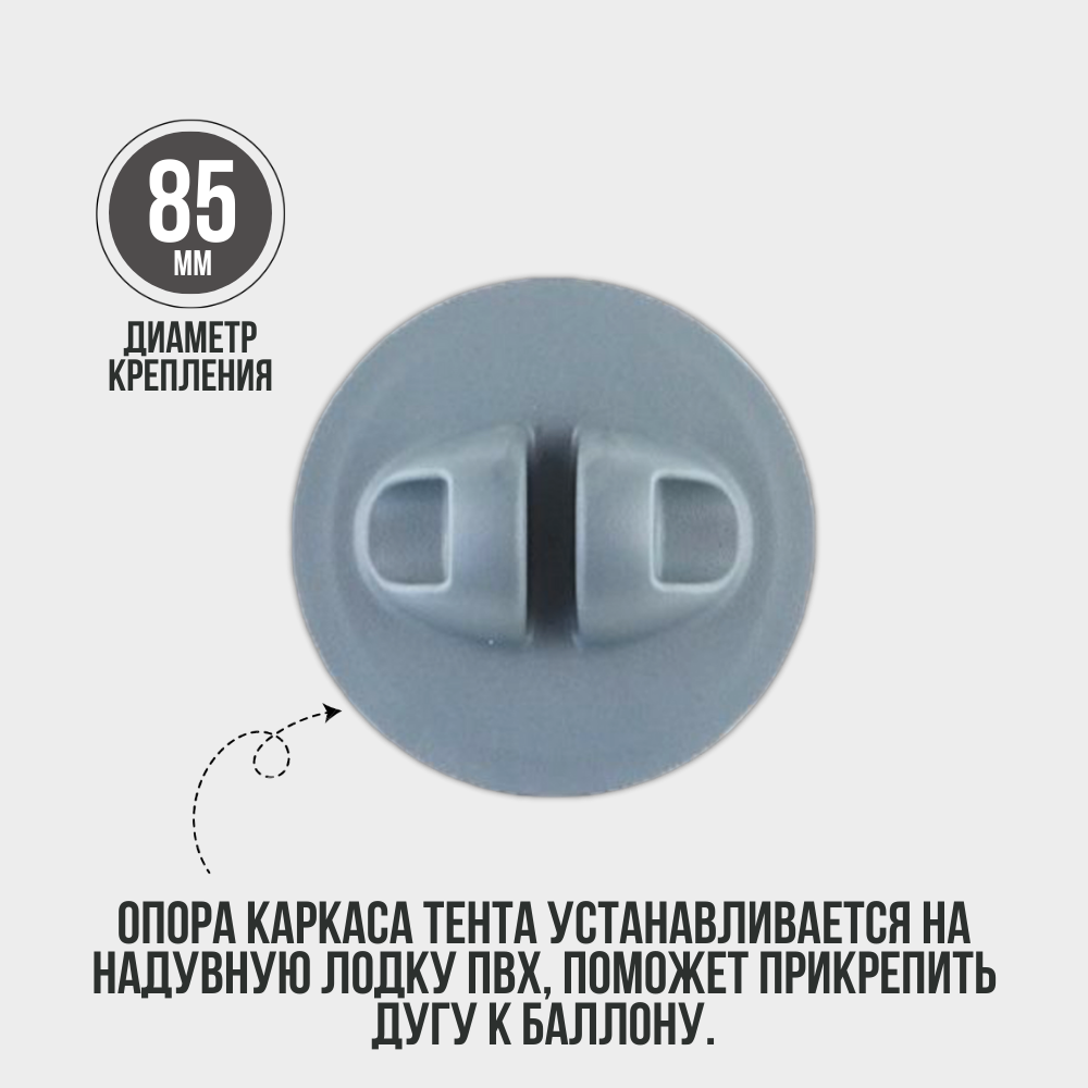 Опора каркаса тента устанавливается на надувную лодку пвх, поможет прикрепить дугу к баллону. Крепление имеет диаметр 85 мм. Приклеивается с помощью полиуретанового клея. В изделие ставится наконечник на трубу.