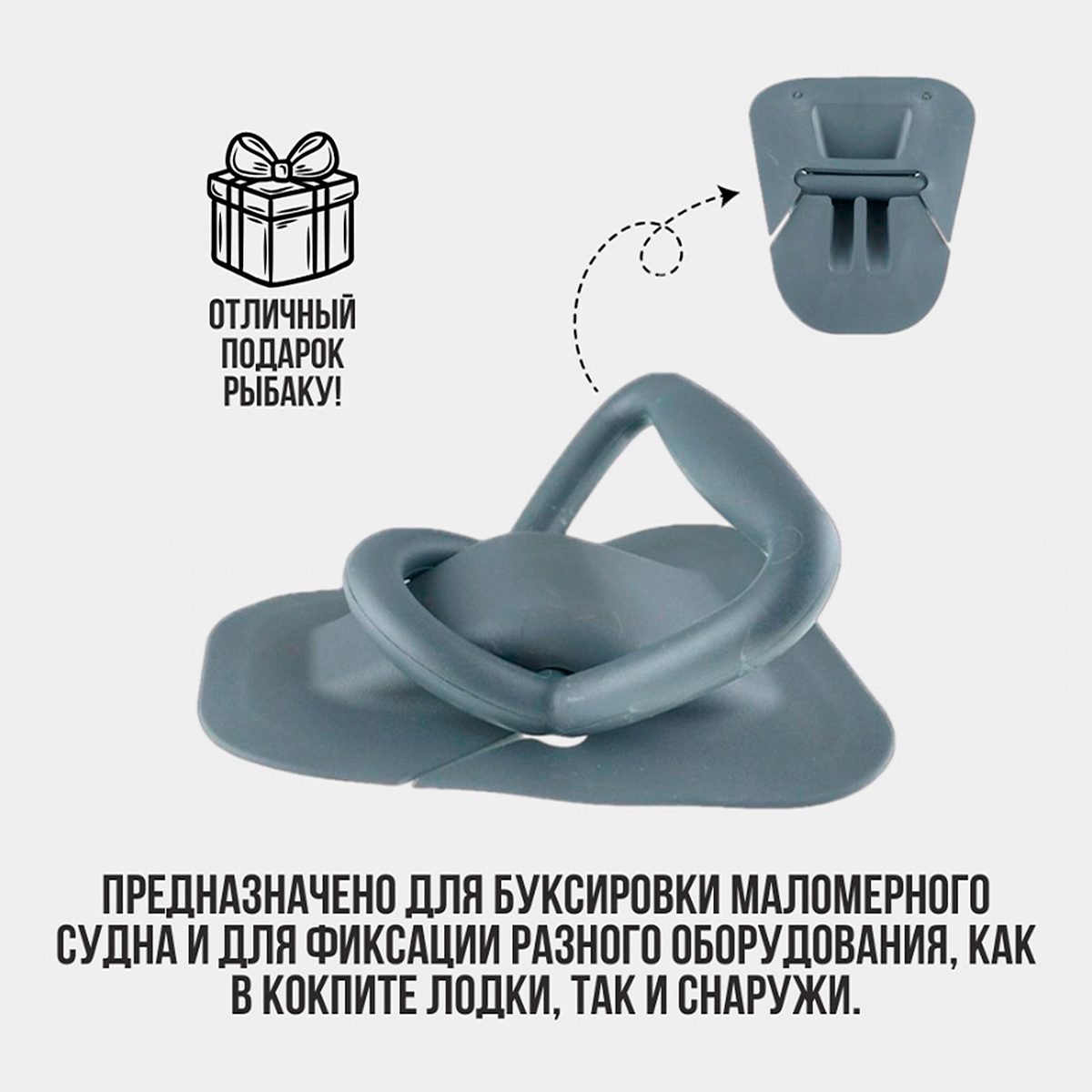 Рым-ручка серая состоит из полиамид пластифицированного ПВХ-основания округлой трапециевидной формы и вставленных в него пластикового полукольца и ручки.