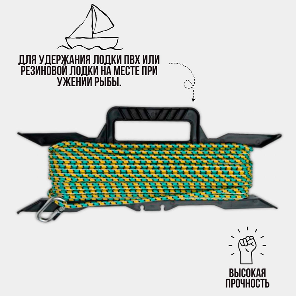 Якорная намотка на мотовиле при использовании совместно с якорем предназначена для удержания лодки ПВХ или резиновой лодки на месте при ужении рыбы. Прочности шнура достаточно для надежного удержания лодки на месте.