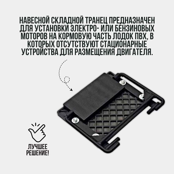 Навесной складной транец предназначен для установки электро- или бензиновых моторов на кормовую часть лодок ПВХ, в которых отсутствуют стационарные устройства для размещения двигателя. При этом изначальная конструкция надувной лодки практически не меняется.Транец отличается высокой прочностью и жесткостью, ведь на него оказывается серьезная нагрузка. Более того, он должен с технической стороны гармонировать с лодочной конструкцией. У лодок из пластика и алюминия транец встроенный, а вот надувные лодки не все обладают такой роскошью. И если вы решили на такую установить мотор, то лучшее решение - покупка транца.Размер транцевой плиты 19,2х25 см. Рым леерный предназначен для крепления леера на надувной лодки ПВХ., данный рым также используется для крепления навесного транца на надувной баллон лодки ПВХ. Диаметр основания леера 78мм, отверстие в леере 11.8 мм.
