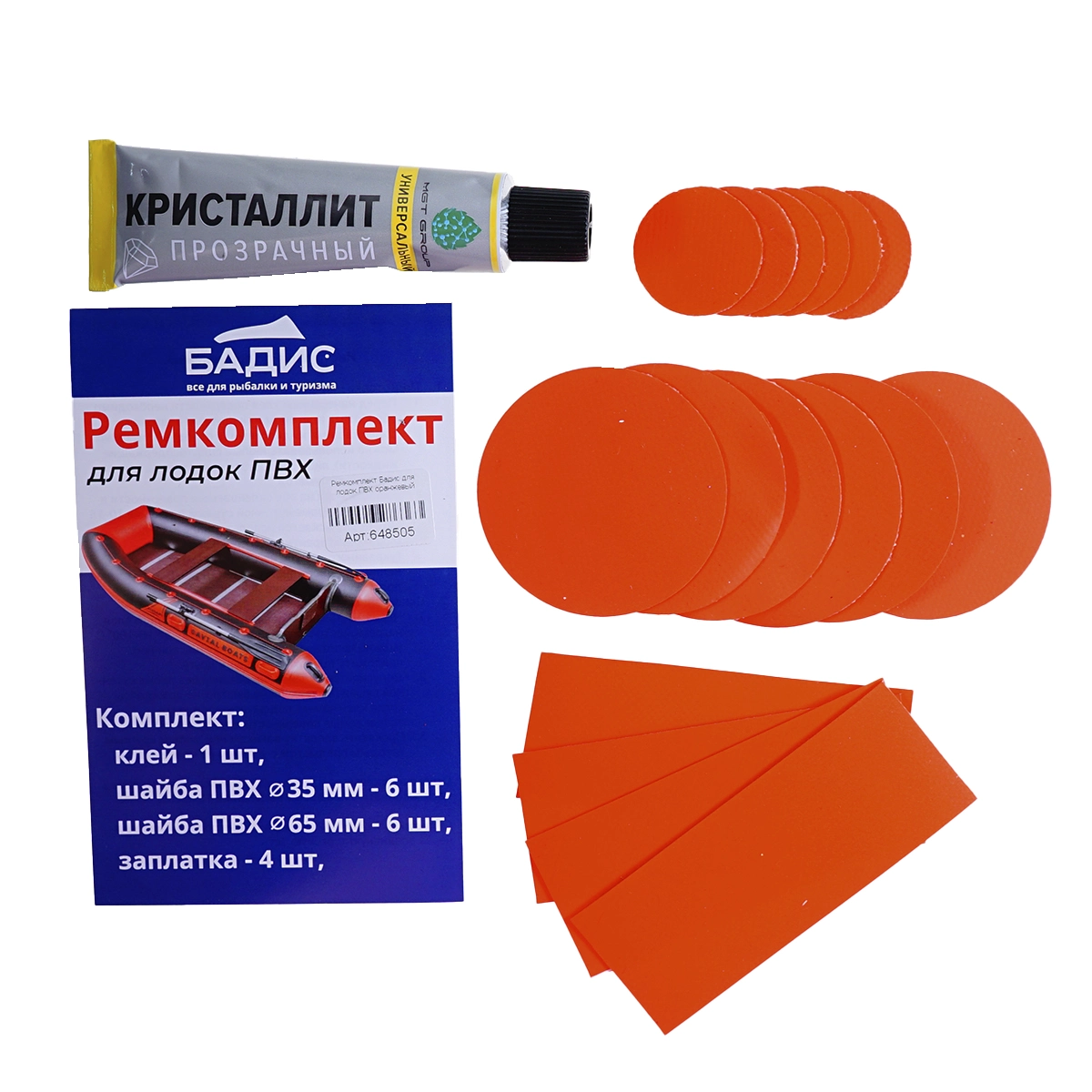 Ремкомплект Бадис для ремонта лодок ПВХ, оранжевый — готовая система для быстрого и надежного устранения повреждений в лодках, SUP-бордах, матрасах и других изделиях из ПВХ. В комплект входят: