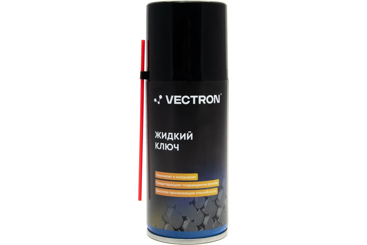 Жидкий ключ Vectron предназначен для облегчения отвинчивания резьбовых соединений всех типов, приржавевших (заржавелых) деталей и механизмов, обладает высокой проникающей, пропитывающей, очищающей способностями, а также смазывающими, водоотталкивающими и антикоррозионными свойствами: быстро проникает в грязь и внутрь ржавчины, возвращает подвижность и смазывает резьбовые соединения, петли, замки, предотвращает заклинивание и срыв резьбы, устраняет скрип и заедание деталей. Применяется при ремонте любых транспортных средств и механизмов, для сантехнических и слесарных работ. Аэрозольная форма выпуска облегчает обработку труднодоступных соединений.