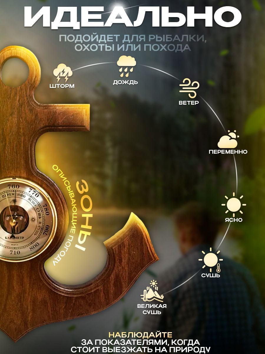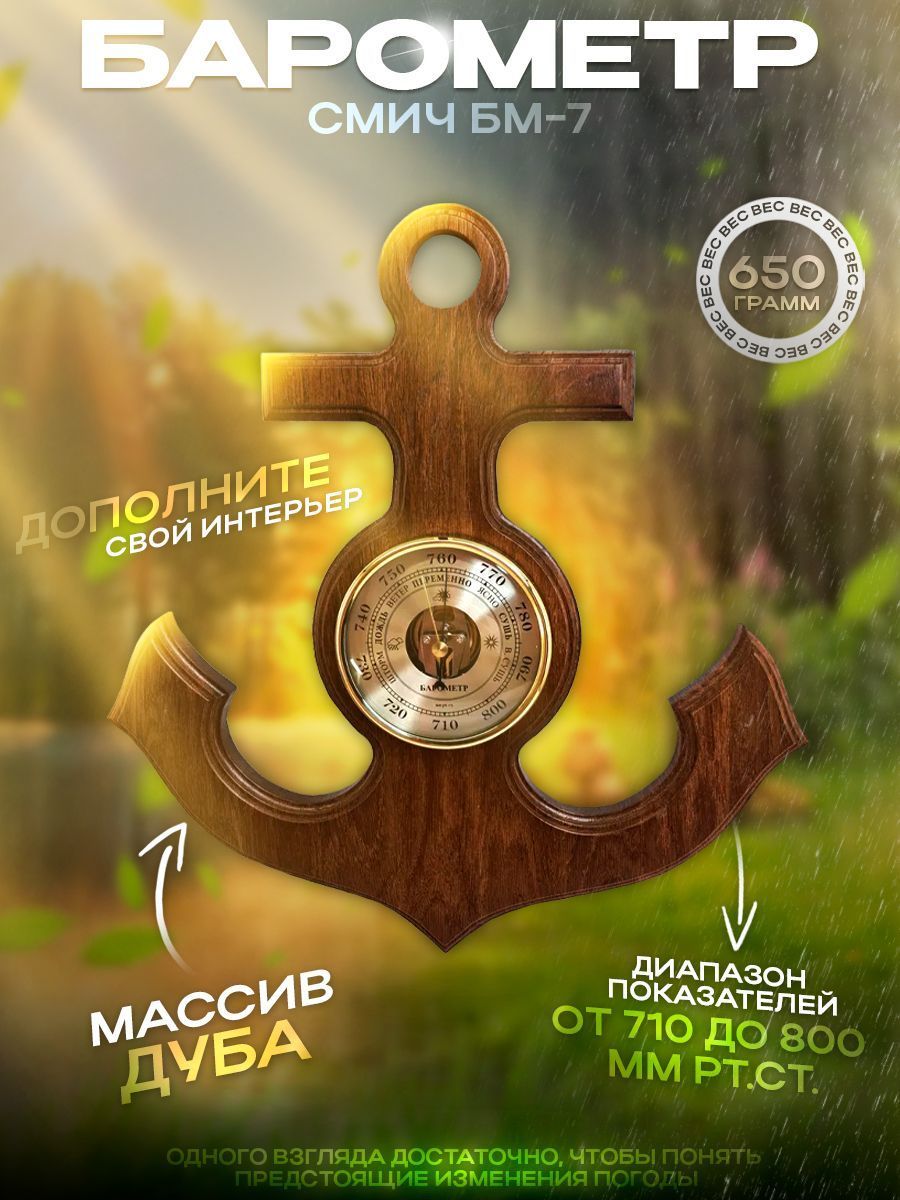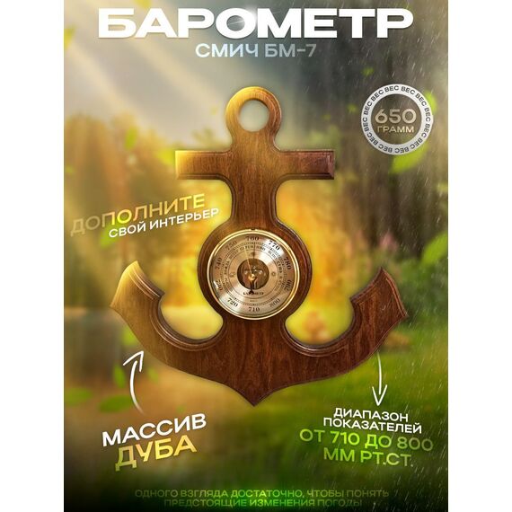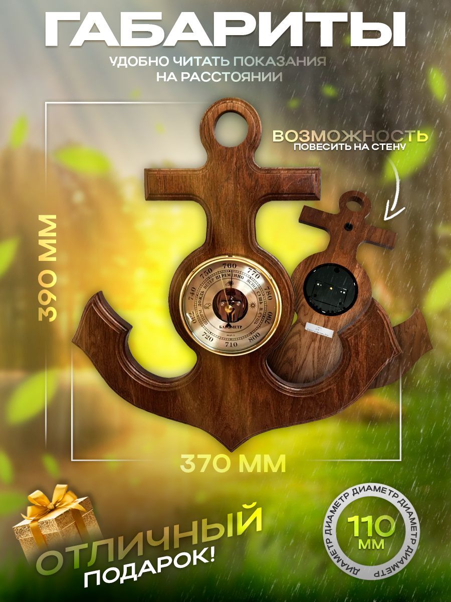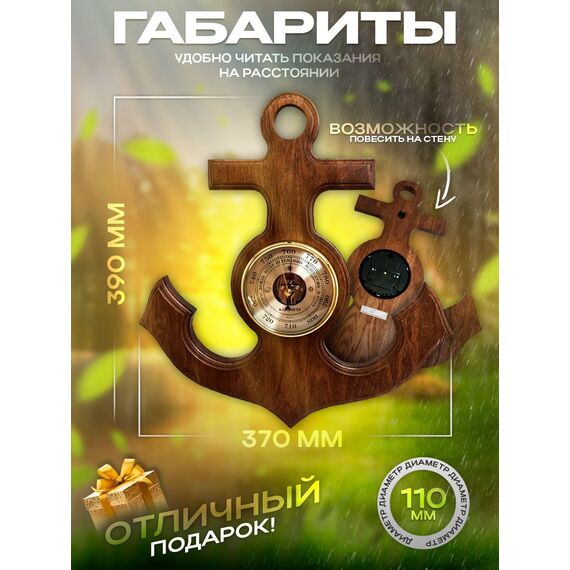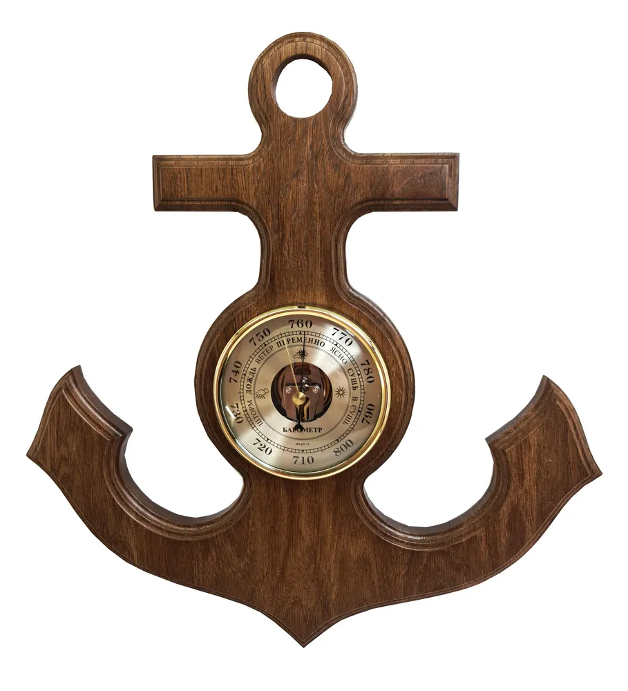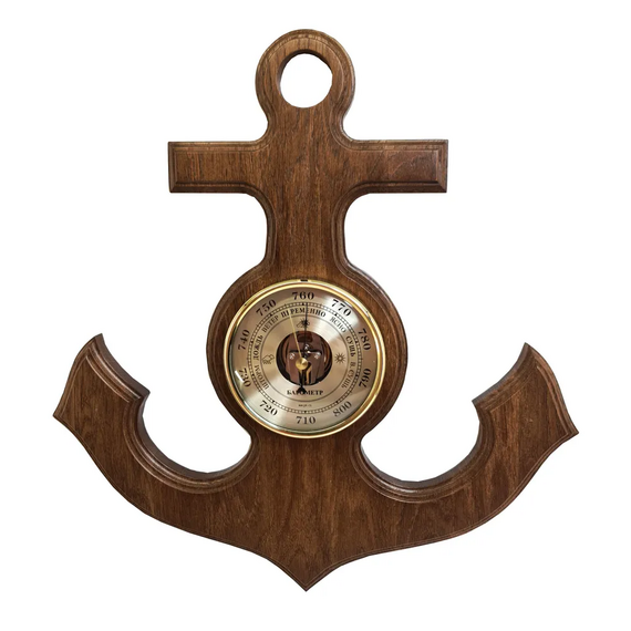 Барометр - это настенный барометр (есть вариант с часами), изготовленный из массива дуба в виде якоря. Диаметр барометра составляет 108 мм, а общий размер - 390х370 мм. Его универсальный дизайн и открытая центральная часть механизма придают ему оригинальный вид. Оформление выполнено в теплых тонах оттенка ореха.