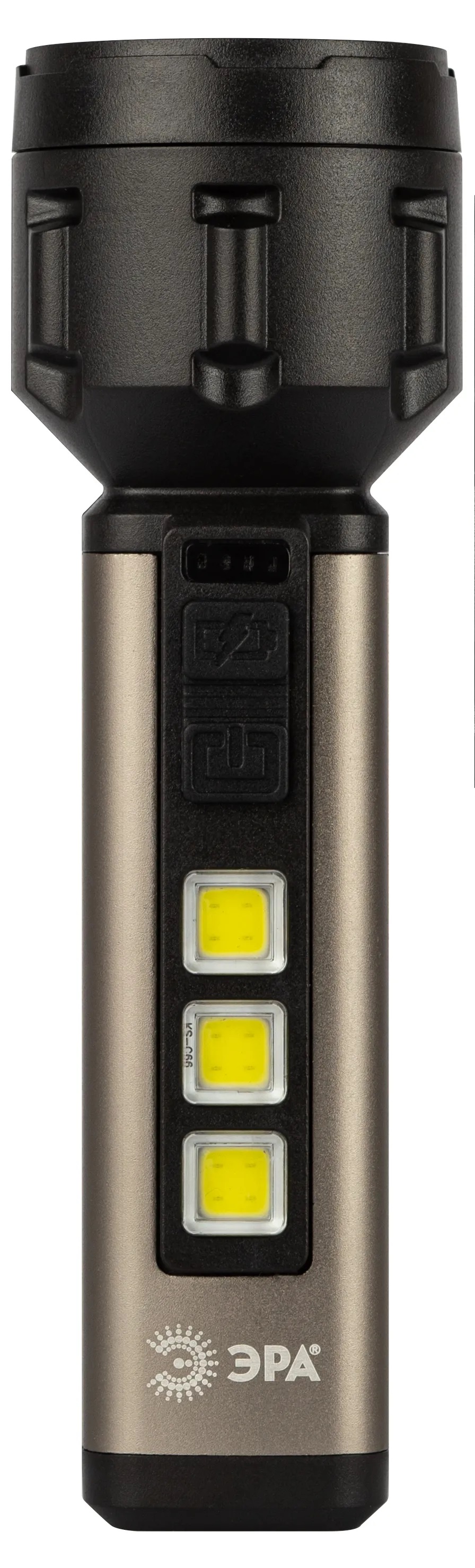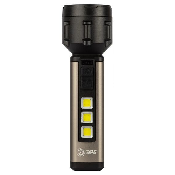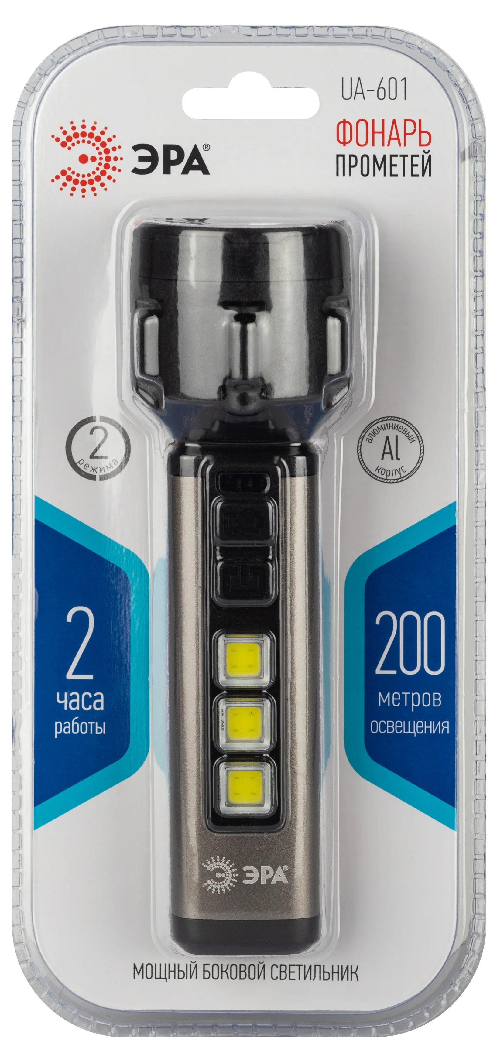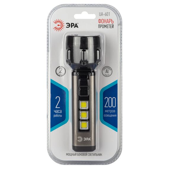 ЭРА UA-601 «Прометей» - аккумуляторный ручной фонарь с мощным 3-сегментным боковым светильником. Уникальный для российского рынка дизайн. Яркий головной луч (1 SMD-светодиод) дальностью до 200 метров помогает качественно освещать дорогу или подсвечивать конкретные предметы. Боковой светильник, состоящий из 3 компактных, но очень ярких COB-матриц с инновационными микросветодиодами, формирует широкое заливающее освещение.