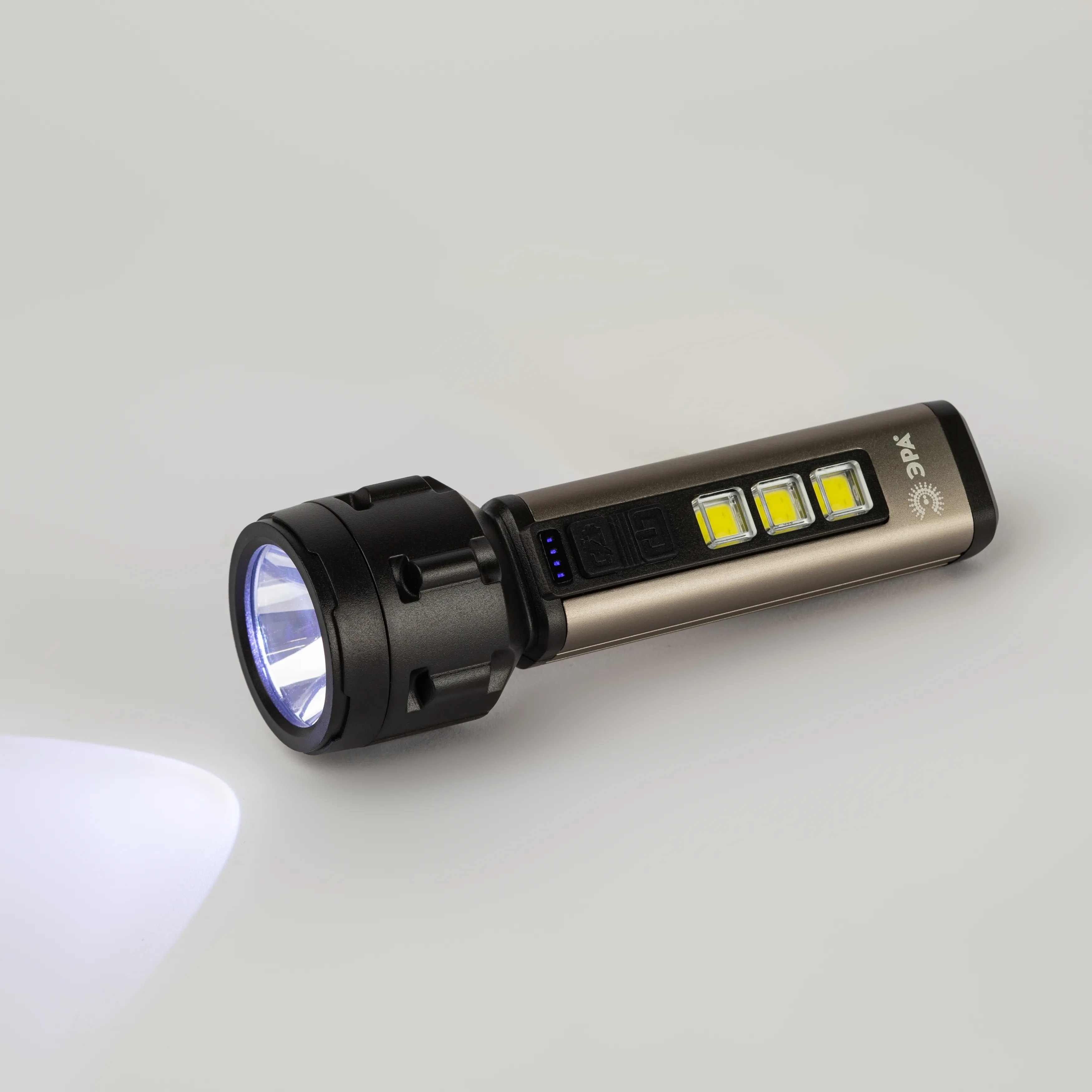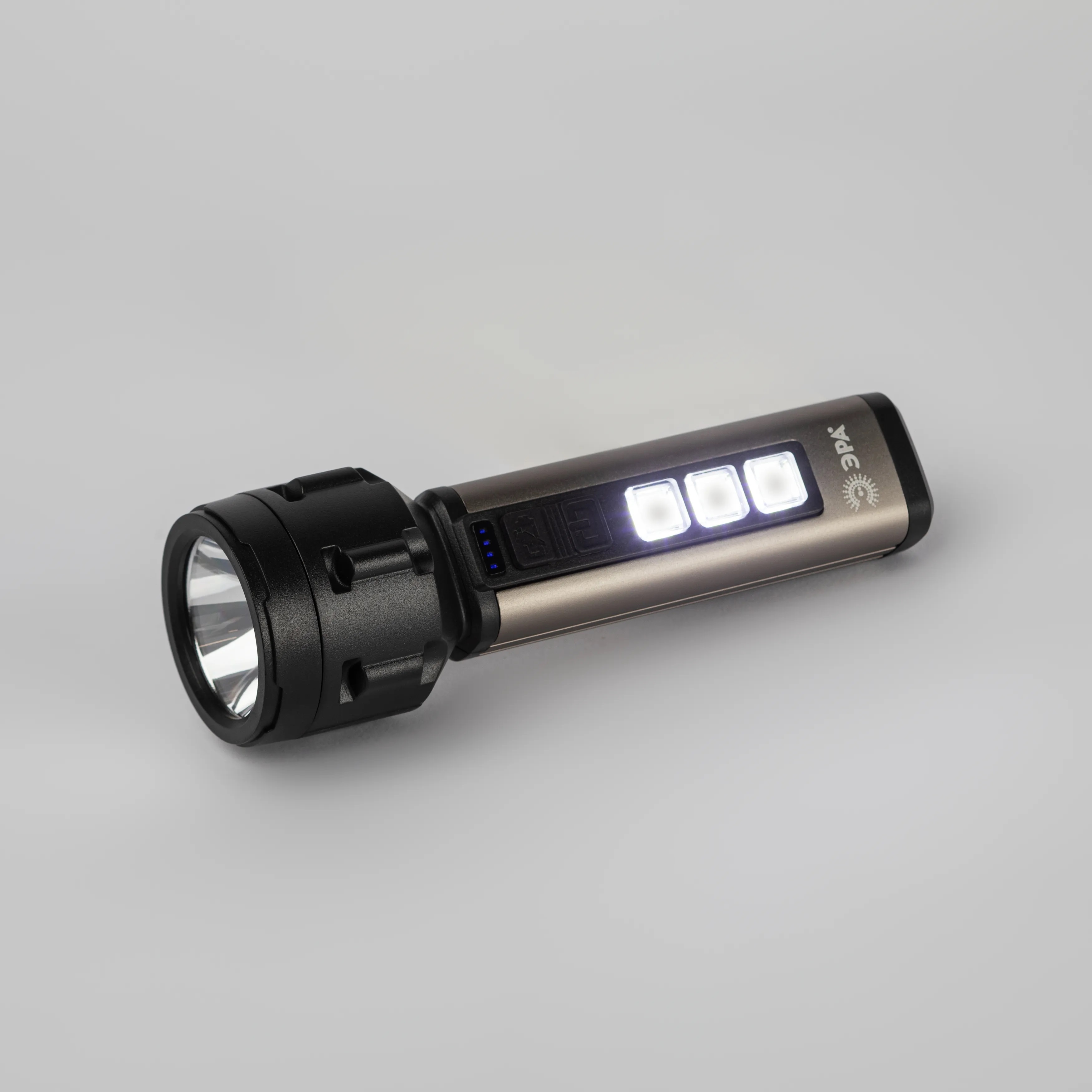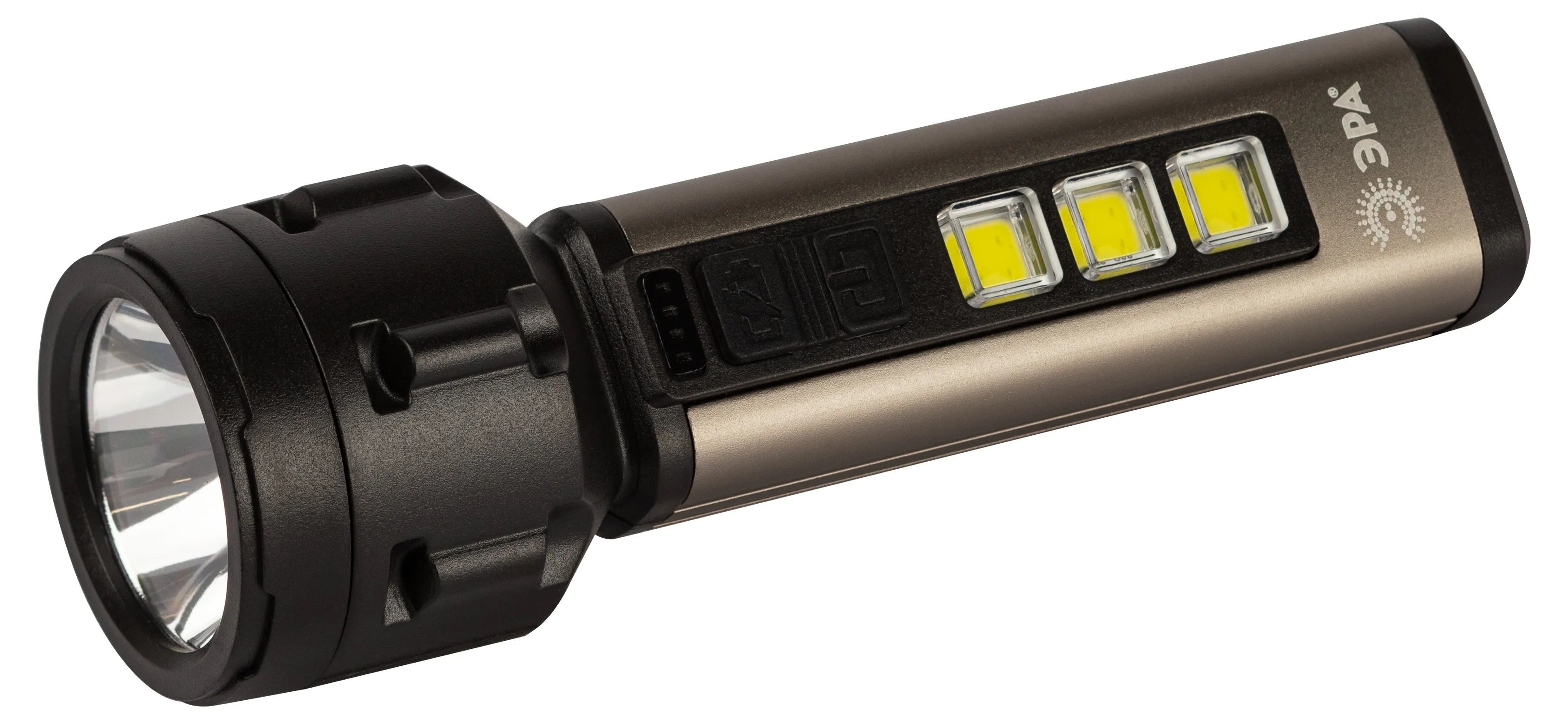 ЭРА UA-601 «Прометей» - аккумуляторный ручной фонарь с мощным 3-сегментным боковым светильником. Уникальный для российского рынка дизайн. Яркий головной луч (1 SMD-светодиод) дальностью до 200 метров помогает качественно освещать дорогу или подсвечивать конкретные предметы. Боковой светильник, состоящий из 3 компактных, но очень ярких COB-матриц с инновационными микросветодиодами, формирует широкое заливающее освещение.