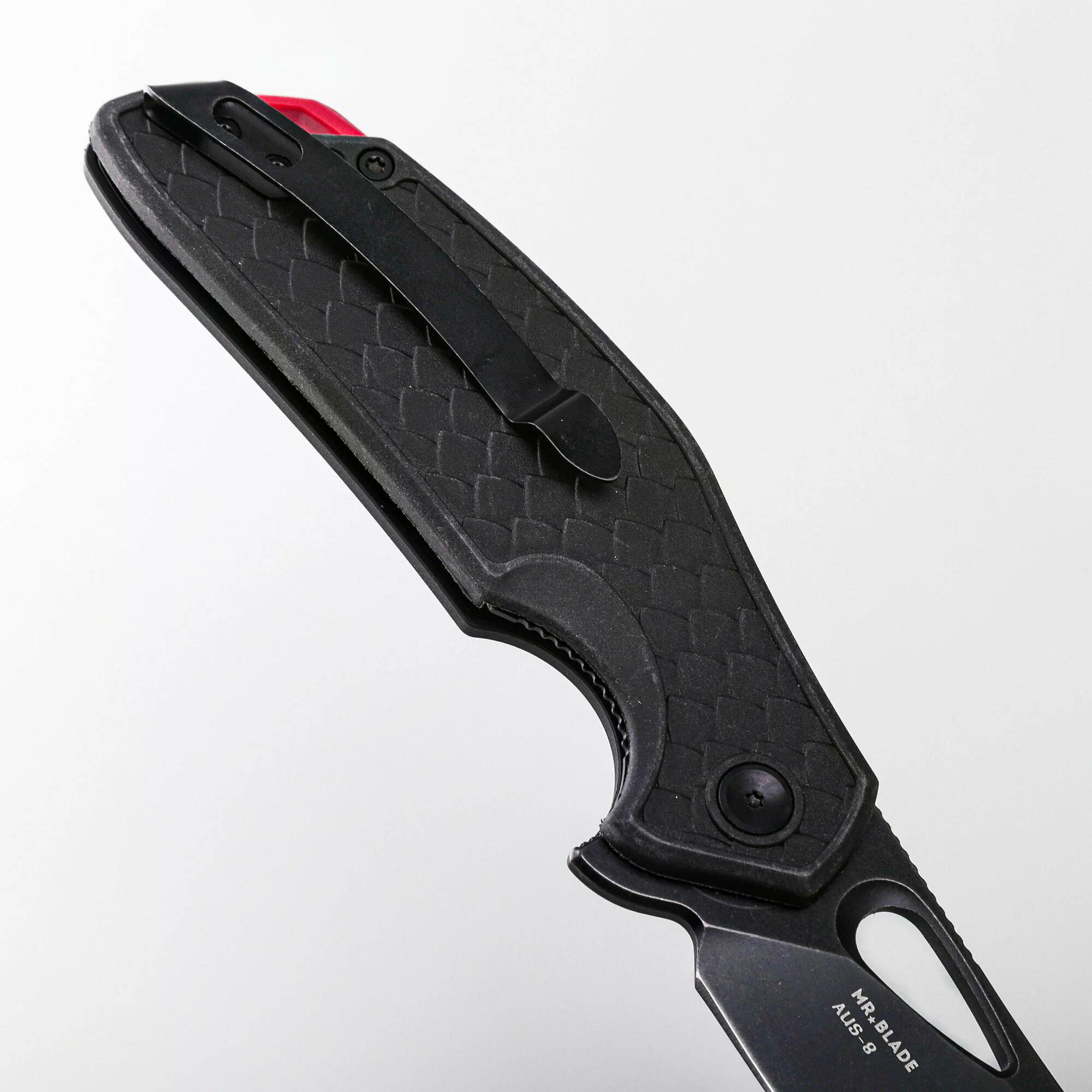 Клинок ножа выполнен в классической форме spay-point, которая обеспечивает универсальность и точность реза. Клинок выполнен из стали AUS-8, которая известна своей твёрдостью, лёгкостью в заточке и хорошей стойкостью режущей кромки, что делает нож отличным выбором для регулярного использования. Особую привлекательность клинку придает обработка blackwash, которая не только улучшает его внешний вид, но и скрывает мелкие царапины. Механизм открытия — удобный флиппер, обеспечивающий быстрое и плавное открытие одной рукой, а надежный замок liner lock гарантирует безопасность при работе.