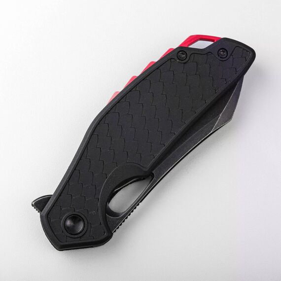 Рукоять и бекспейсер выполнены из прочного и лёгкого материала FRN, который отличается высокой устойчивостью к ударам и воздействию окружающей среды. Особенность дизайна рукояти — текстура, имитирующая драконью чешую, которая обеспечивает уверенный и комфортный хват. Насечки на спейсере, напоминающие спинной гребень, добавляют изделию оригинальности и подчеркивают драконий мотив. Эргономичная форма рукояти делает использование ножа удобным в любых условиях. Нож также оснащён клипсой, позволяющей удобно носить его в кармане, а также отверстием под темляк для дополнительной персонализации или удобства ношения.