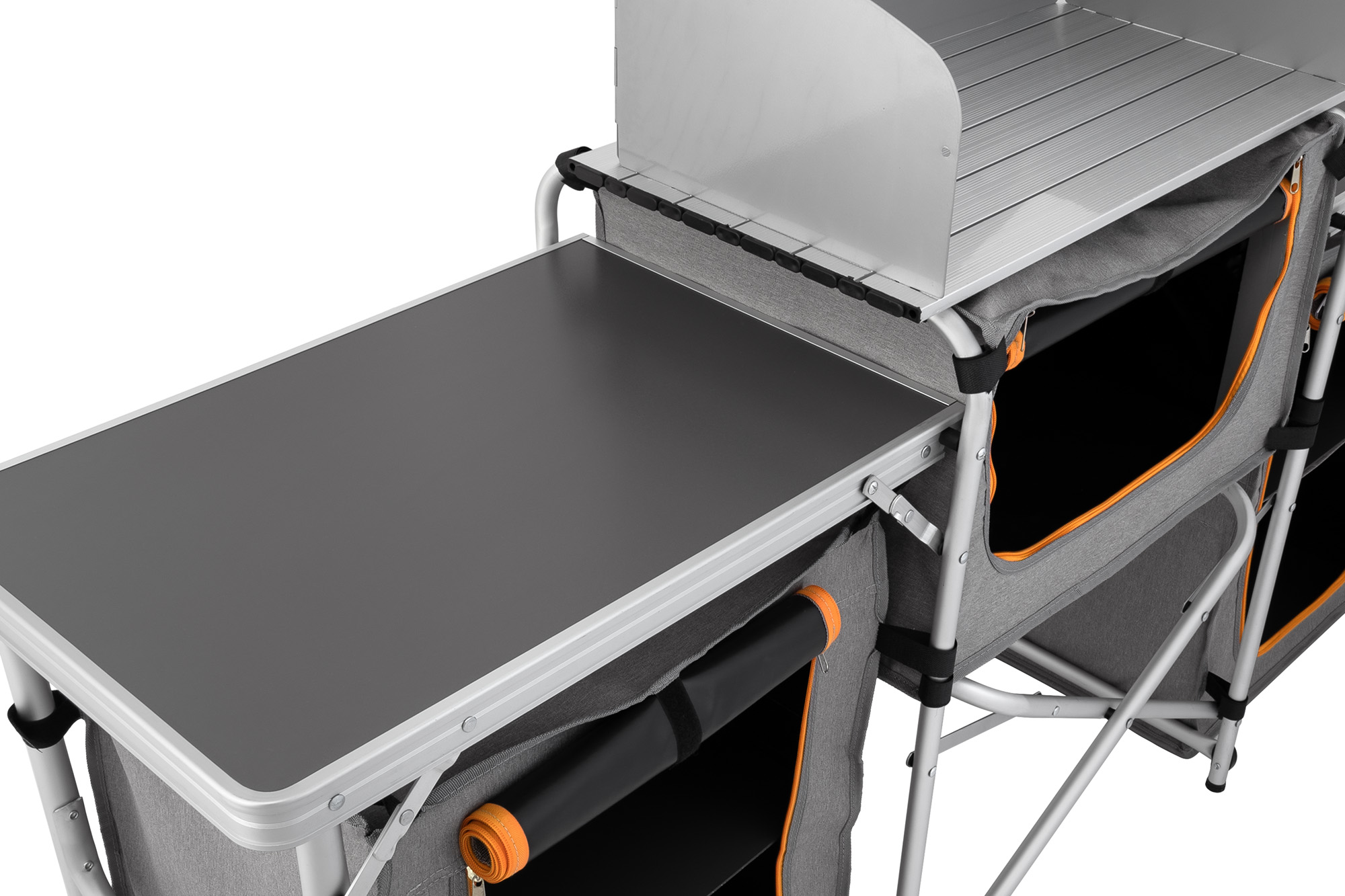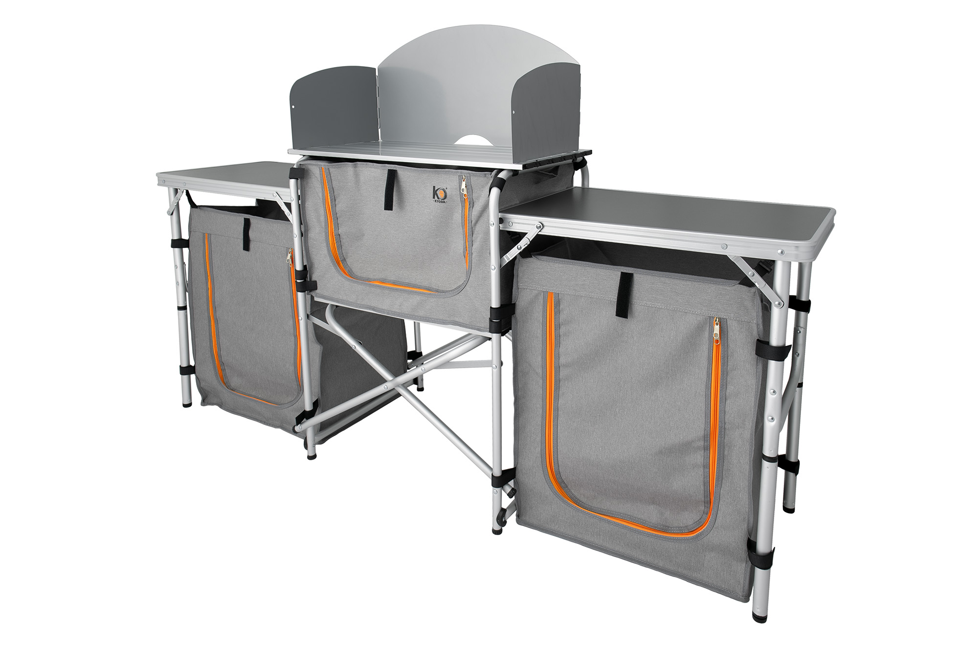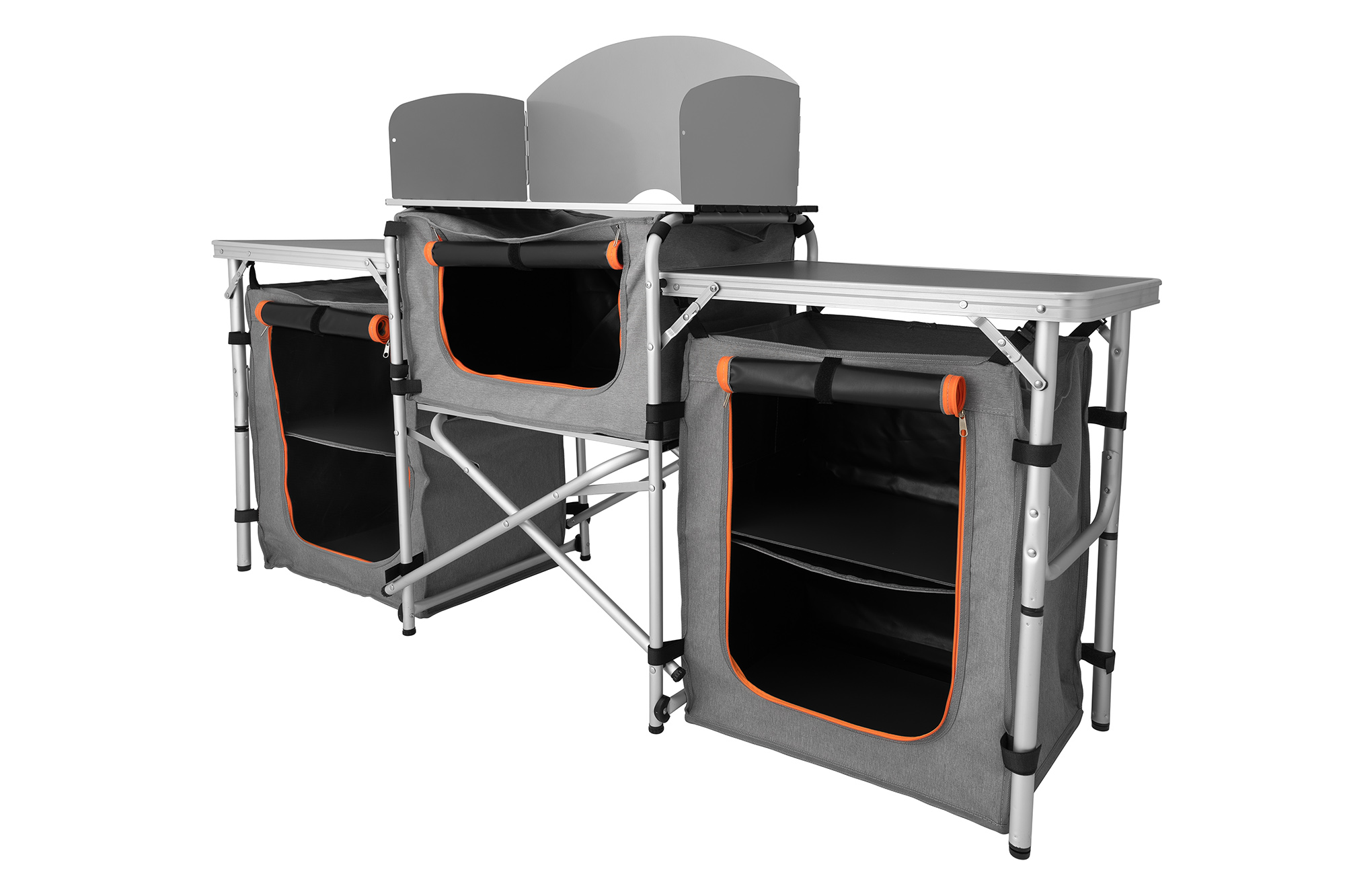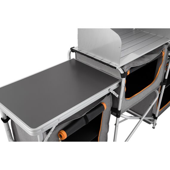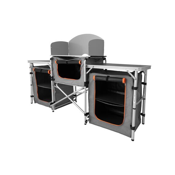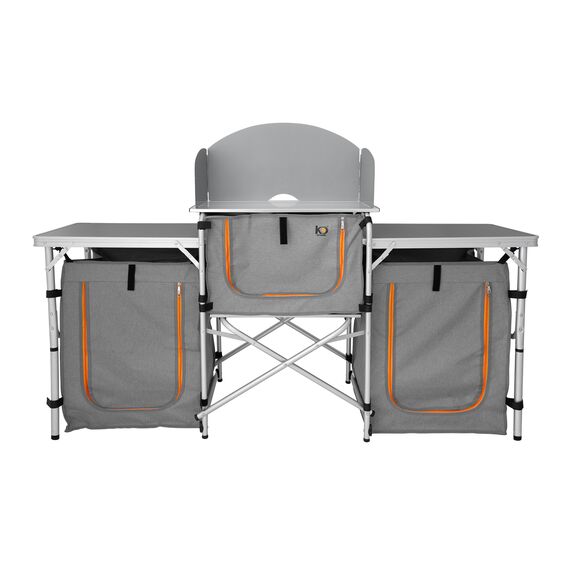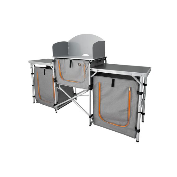 - Складные ножки регулируются по высотеБлагодаря ножкам с регулировкой по высоте кемпинговая кухня устойчива даже на неровной поверхности.