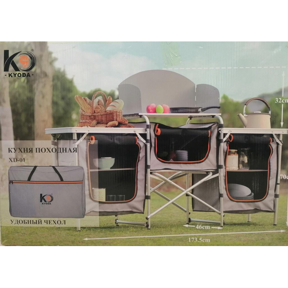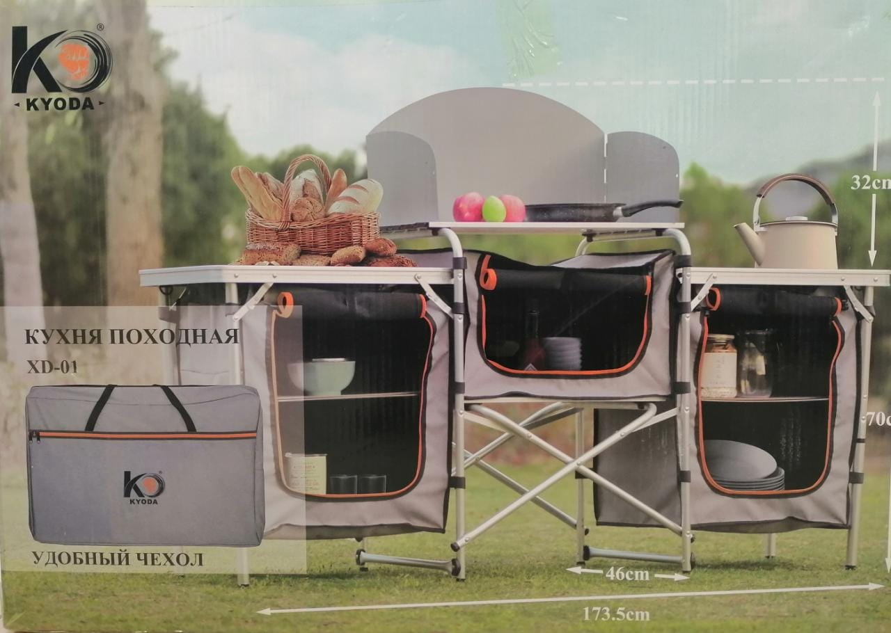 Походная туристическая кухня Kyoda XD-01Походная кухня для кемпинга, рыбалки, туризма, пикника позволяет отдыхать на природе с полным комфортом. Раскладная конструкция – алюминиевый каркас по типу шезлонга, мягкие шкафы подвешиваются на крючки и фиксируются липучками. Дверцы-клапаны на молнии, на обоих торцах карманы для мелочей. Ножки регулируются по высоте, предусмотрена ветрозащита плиты и отверстие под газовый шланг или электрокабель. Длина установленной кухни KYODA XD-01 – 173,5 см, глубина – 46 см, высота до столешниц – 70 см. Вес – 13,5 кг. В комплекте удобная сумка для переноски.