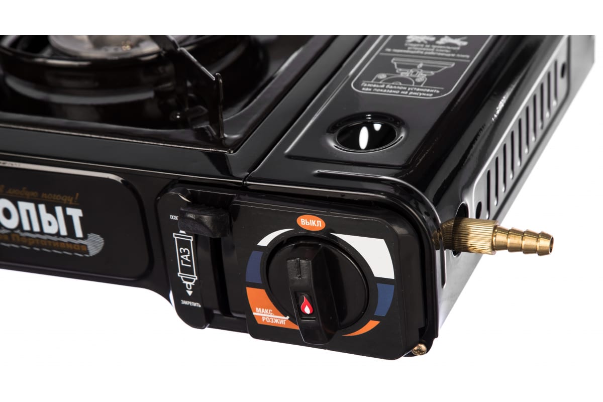 Газовая плита с переходником Следопыт Black PF-GST-N10 пригодится в загородном доме, на даче или во время отдыха на открытом воздухе. Работает от нажимных баллонов с цанговым захватом.