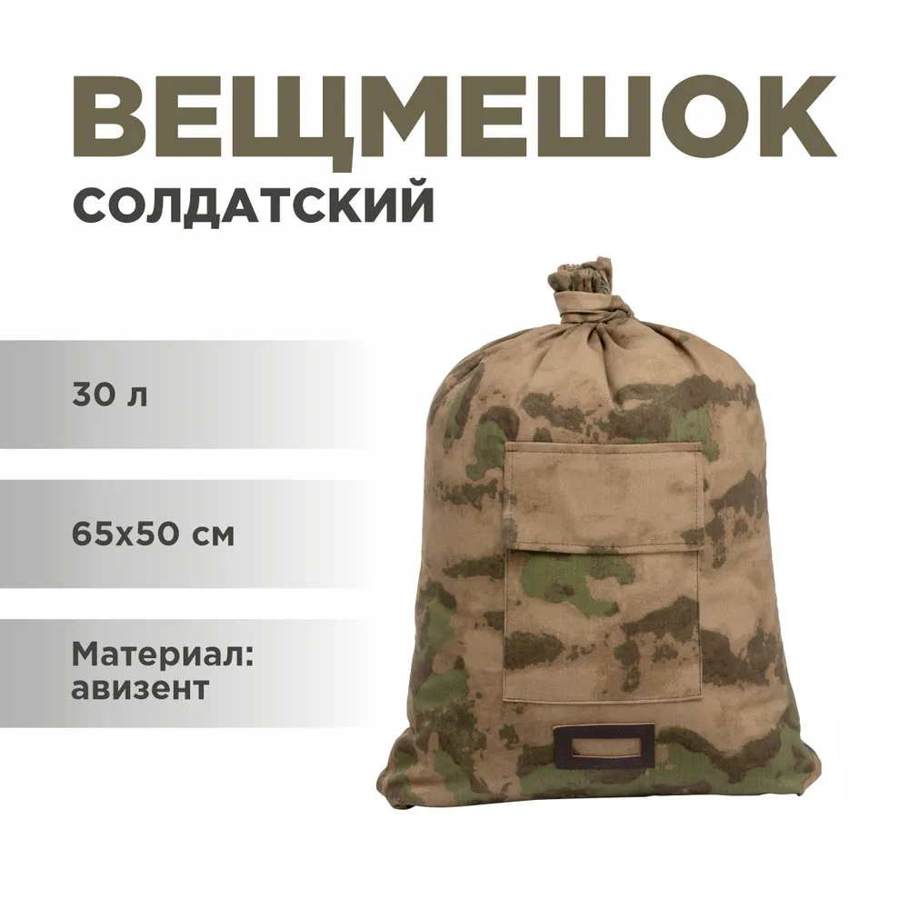 Мешок вещевой объемом 30 л. На передней стенке мешка имеется плоский карман с клапаном и кожаная рамка для таблички. К нижним углам мешка пришит длинный ремень, которым стягивается верх мешка и формируются лямки.